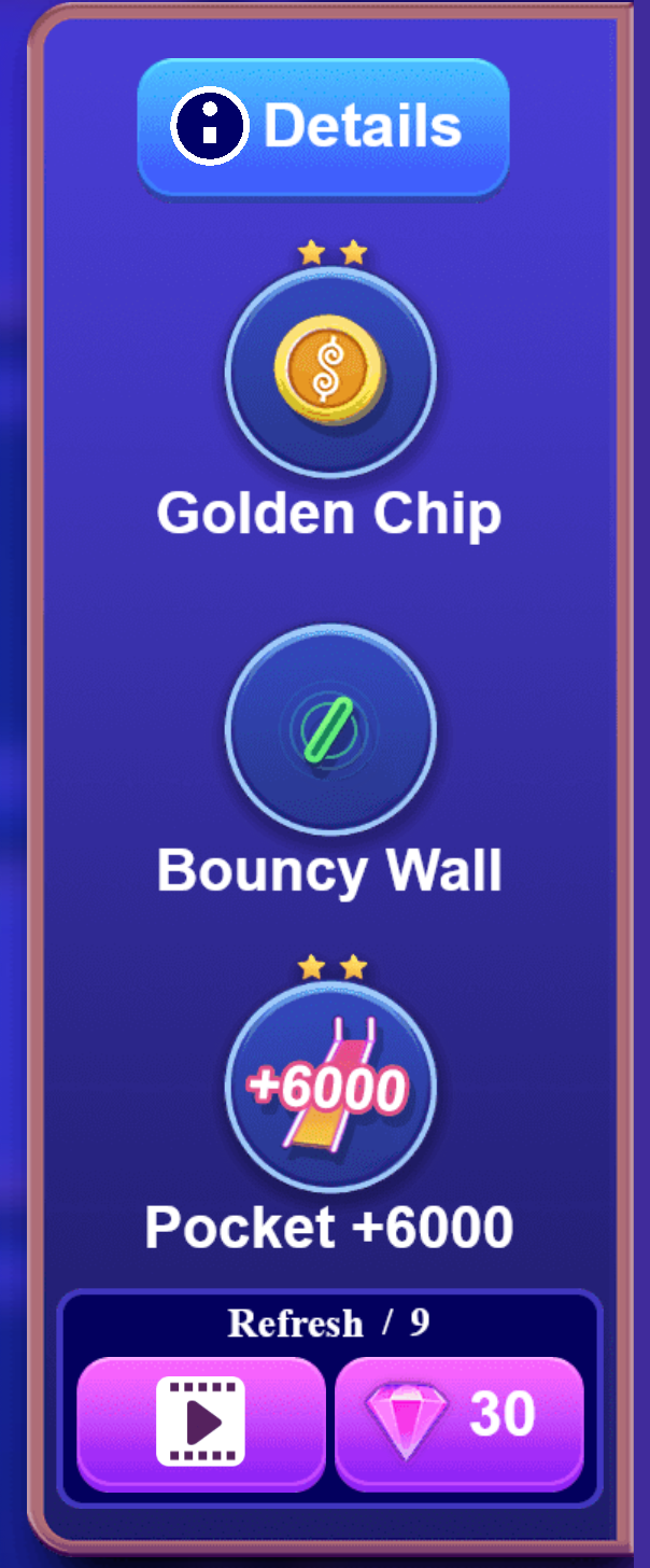 Pocket +3000. Another straightforward upgrade. You can choose which pocket to apply the upgrade to increase its value by +3000. Most of the time, you want to set up your upgrades around a specific area, and many of your chips will be dropped within this area. This upgrade provides a great finishing touch to such a strategy.