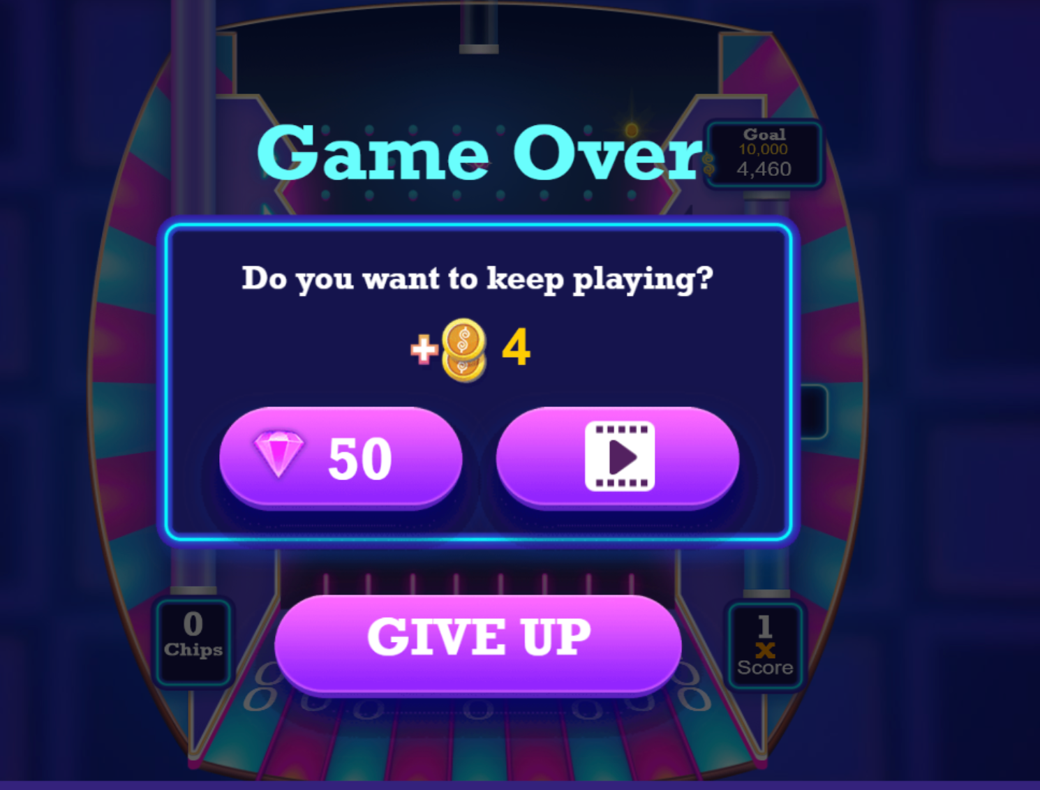 If you do not meet the goal, you'll encounter a Game Over. If you'd like to keep playing with 4 more chips, you can do so in exchange for Gems or for watching an ad.